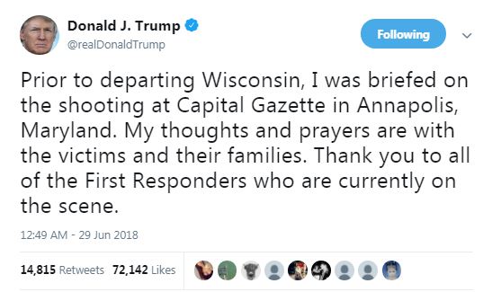 პრეზიდენტი დონალდ ტრამპი მომხდარს „ტვიტერზე“ გამოეხმაურა, მისი თქმით, ანაპოლისში მომხდარის შესახებ დაუყოვნებლივ აცნობეს. ის სამძიმარს უცხადებს გარდაცვლილების ოჯახებს და აღნიშნავს, რომ ის „ლოცულობს დაღუპულებისთვის და მათი ოჯახებისთვის“.