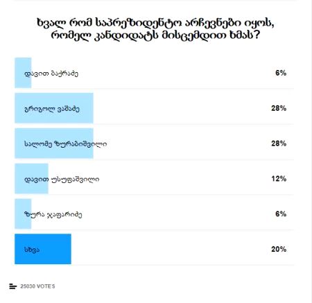 შეკითხვაზე: ხვალ რომ საპრეზიდენტო არჩევნები იყოს, რომელ კანდიდატს მისცემდით ხმას? „ნაციონალური მოძრაობის“ კანდიდატი გრიგოლ ვაშაძე და მმართველი გუნდის მიერ მხარდაჭერილი კანდიდატი სალომე ზურაბიშვილი გამოკითხვაში მონაწილეთა 28-28%-მა აირჩია.