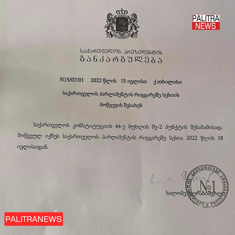 რიგგარეშე სესიის მოწვევი თაობაზე პრეზიდენტს 46-მა ოპოზიციონერმა დეპუტატმა მიმართა, მათი მოთხოვნის გათვალისწინებთ, სესია 18 ივლისიდან არის მოწვეული.