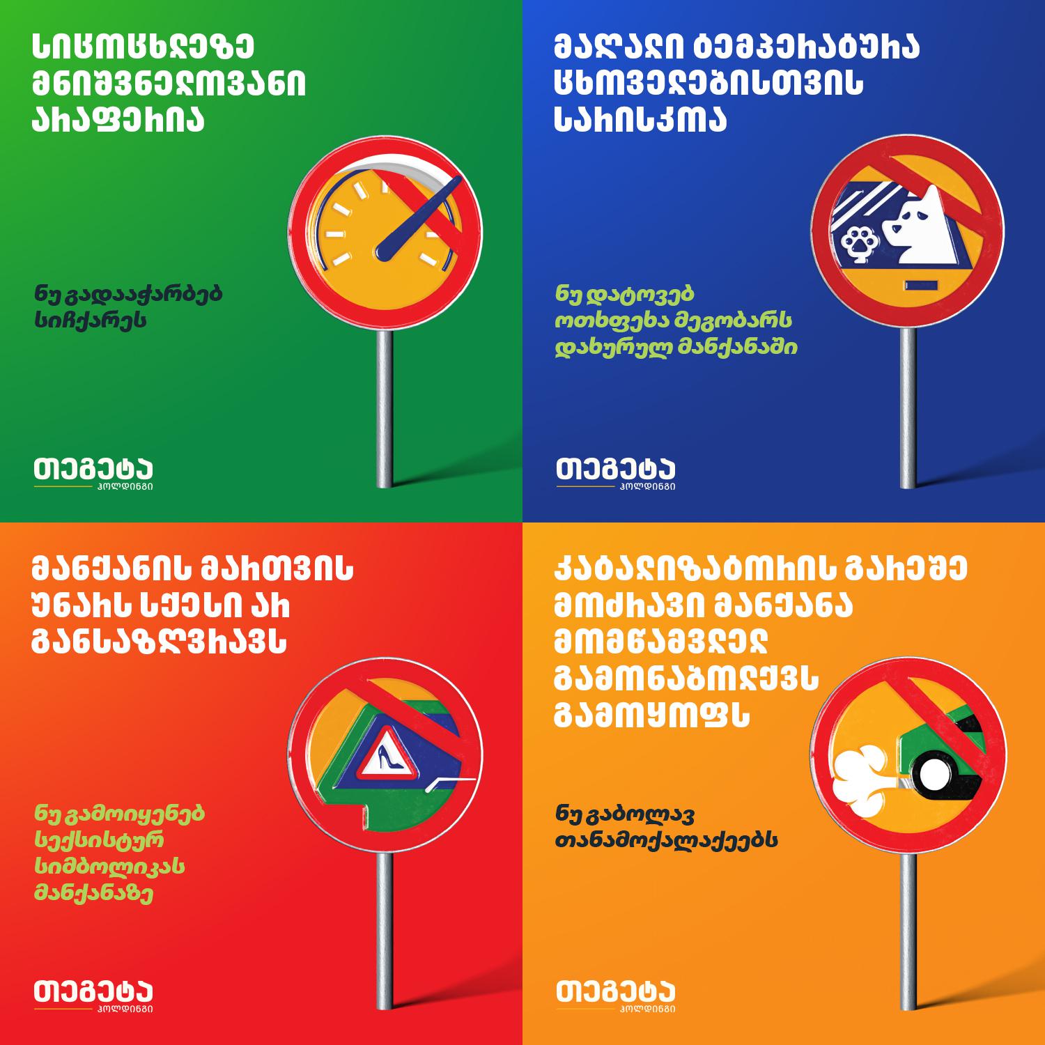 საქართველოში მძღოლებისა თუ ქვეითების გარკვეულ ნაწილს მრავალი მანკიერი ჩვევა ახასიათებს და წესების დარღვევა მათთვის ჩვეული მოვლენაა. სწორედ საგზაო მოძრაობის კულტურის ამაღლებას ემსახურება „თეგეტა ჰოლდინგის“ ახალი კამპანია, რომლის ფარგლებშიც მთელ საქართველოში უჩვეულო საგზაო ნიშნები გამოჩნდა.