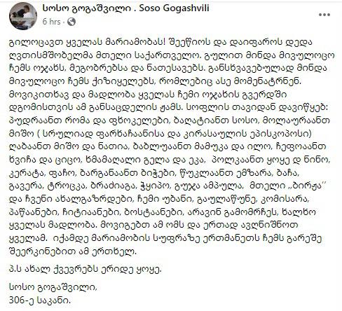 სუს-ის ყოფილი მაღალჩინოსანი, ამჟამად პატიმრობაში მყოფი სოსო გოგაშვილი საზოგადოებას მარიამობას ულოცავს. მისალოცი ტექსტი "ფეისბუქში" გოგაშვილის გვერდზე გამოქვეყნდა.