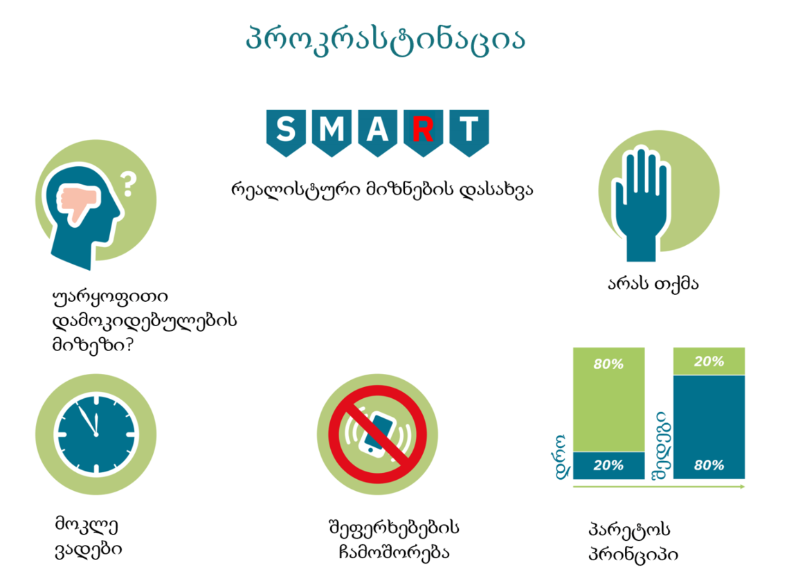 - რეალისტური, SMART მიზნების დასახვა. დიდი ამოცანების დაყოფა ქვეამოცანებად და მათი ნაბიჯ-ნაბიჯ შესრულება.