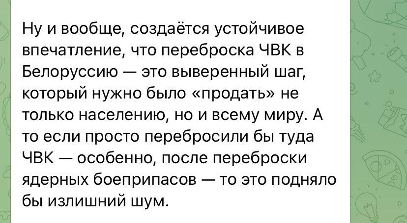 "რჩება შთაბეჭდილება, თითქოს, "ვაგნერის“ ბელარუსში გადასროლა - წინასწარ გათვლილი ნაბიჯია, რომელიც საჭირო იყო არა მხოლოდ რუსეთის მოსახლებისთვის "მიეყიდათ“, არამედ მთელი მსოფლიოსთვის. უბრალოდ რომ გადაესროლათ იქ, განსაკუთრებით ბირთვული არსენალის გადაცემის შემდეგ, ეს ყველაფერი მოჭარბებულ ხმაურს გამოიწვევდა“ - წერს ერთ-ერთი რუსული არხი "ტელეგრამზე".