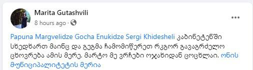 "კაბინეტენში სხედხართ მაინც და გეგმა ჩამომიწერეთ, როგორ გავაგრძელო ცხოვრება ამის მერე. მარტო მე ვრჩები ოჯახიდან ცოცხალი", - წერს მარიტა.