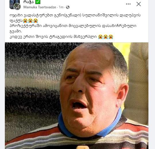 დღეს კი მისი სიძე, მამუკა ცერცვაძე წერს, რომ ოჯახი ადასტურებს სულთანიშვილის დაღუპვის ფაქტს. მამუკა ცერცვაძე ინფორმაციას რაჭის ჯგუფში აქვეყნებს.