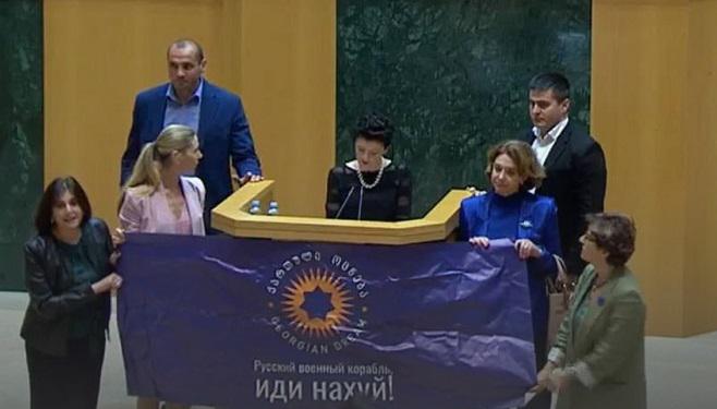 ოპოზიციონერმა დეპუტატმა ქალებმა პარლამენტში პლენარულ სხდომაზე "ქართული ოცნების" ბანერი გაშალეს, რომელზეც ეწერა: