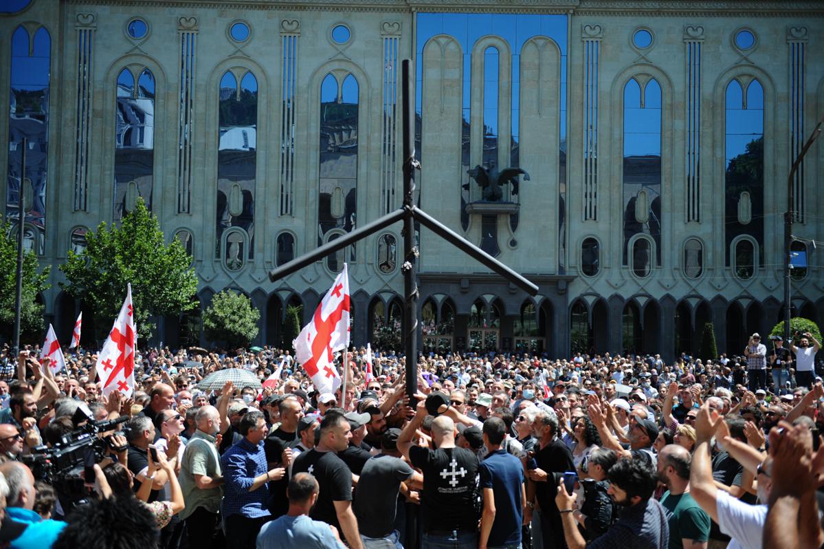 რადიკალებმა პარლამენტის წინ რკინის ჯვარი აღმართეს.