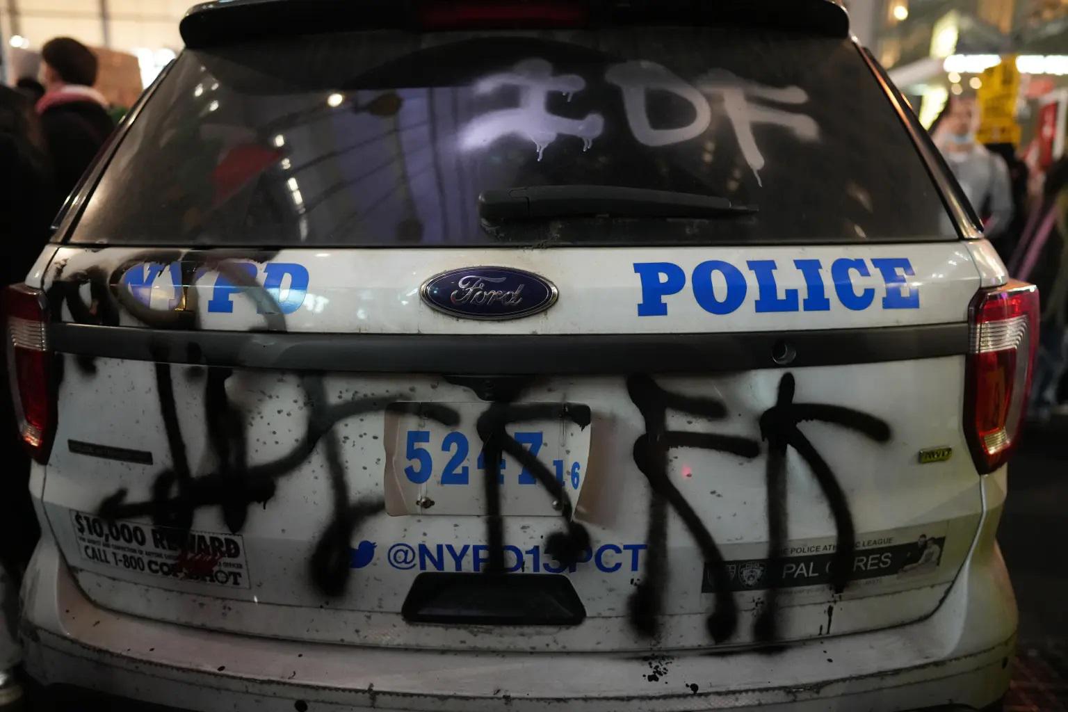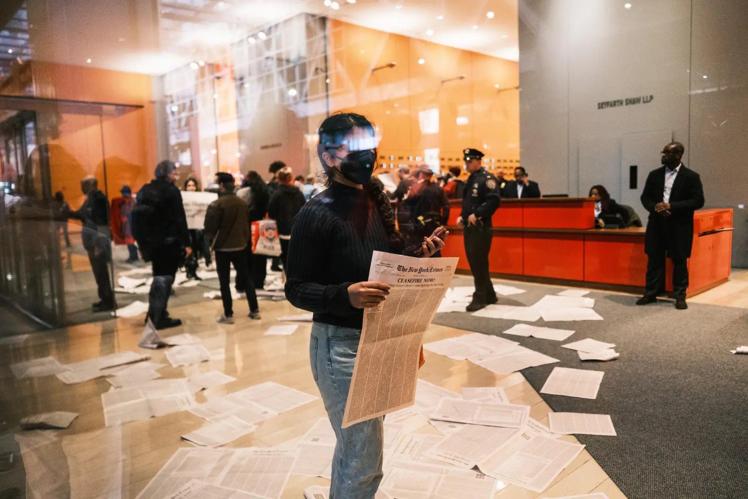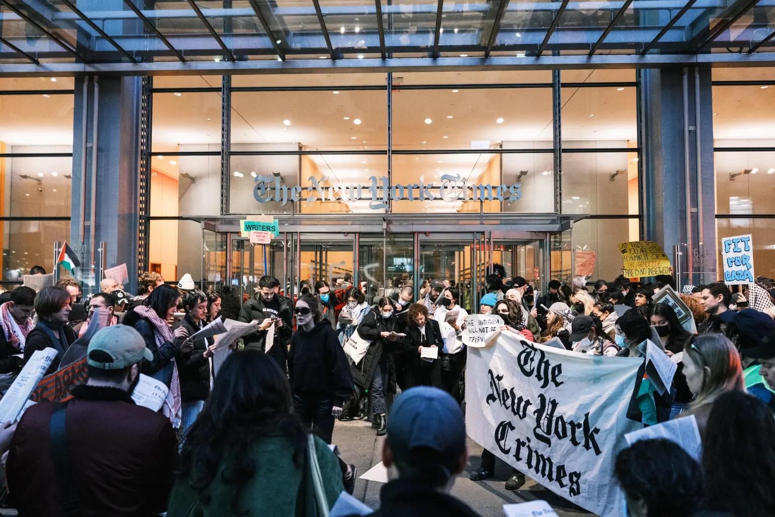 "New York Times-ს პასუხს მოვთხოვთ გენოციდის წაქეზებისთვის. New York Times, ვერ დაიმალები, ბრალს გენოციდში გდებთ!" გარკვეულმა ჯგუფმა, გაზეთის რედაქციის შენობის გარეთ მდგომი პოლიციის მანქანის ფანჯარა ჩაამსხვრია და მის გვერდით, სპრეით "FREE GAZA" მიაწერა. მომიტინგეების თქმით, მათ პალესტინელების მოკვლაში თანამონაწილეობისთვის გაზეთის სარედაქციო კოლეგიის მხილება სურდათ.