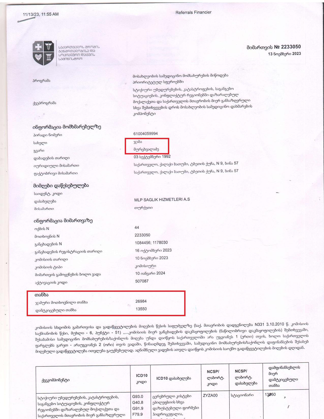 - აქამდე ჯანდაცვის სამინისტროსგან ოფიციალურ პასუხს ველოდებოდი. მეგონა, დაფინანსება 70-80% მაინც იქნებოდა. სამწუხაროდ, მხოლოდ 50%-ია. ეს არის 13.550 ლარი. ახლა მცირე ვადაა მოცემული, რომ ამ დროში დარჩენილი 50% ვიშოვოთ. სამგზავრო თანხა 5.000 ლარი მაქვს. 2.700 ლარი ჩაფრენა-ჩამოფრენა და საჭირო და გაუთვალისწინებელ ხარჯებს სჭირდება. მოკლედ, ახლა მეორე 5.000 დოლარია სასწრაფოდ საშოვნელი, რომ ჩემს შვილს ოპერაცია ჩაუტარდეს. თურქეთის კლინიკაც მზად არის მიგვიღოს და ჩვენც ოჯახი მზად ვართ იმისთვის, რომ სტამბოლში, კერძოდ, "მედიკალ კლინიკში“ წავიდეთ.