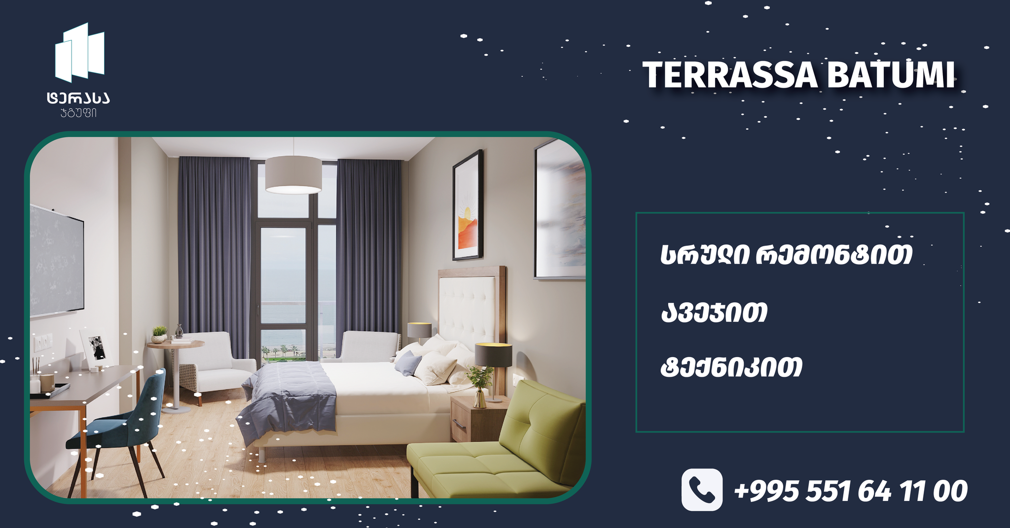 „ტერასა ბათუმი“ ყველაზე პოპულარული ზღვისპირა ქალაქის უკვე დასრულებული პრემიუმ კლასის პროექტია, რომელიც მოიცავს სრულად გარემონტებულ, ავეჯითა და ტექნიკით აღჭურვილ აპარტამენტებსა და სასტუმროს ნომრებს.