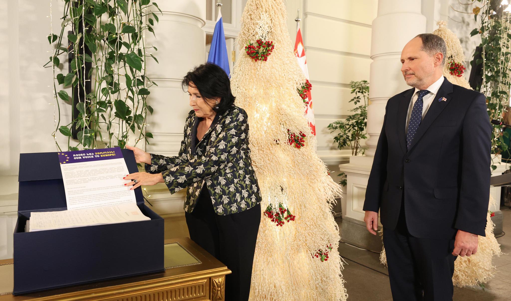 გუშინ ორბელიანების სასახლეში პრეზიდენტმა, სალომე ზურაბიშვილი მიღება გამართა. ღონისძიება კამპანიის "ჩემი ხმა ევროპას“ დასკვნითი ნაწილი იყო და პრეზიდენტმა ევროკავშირის ქვეყნებიდან დიპლომატიური კორპუსის წარმომადგენლებს კამპანიის ფარგლებში შეგროვილი ხელმოწერები გადასცა.