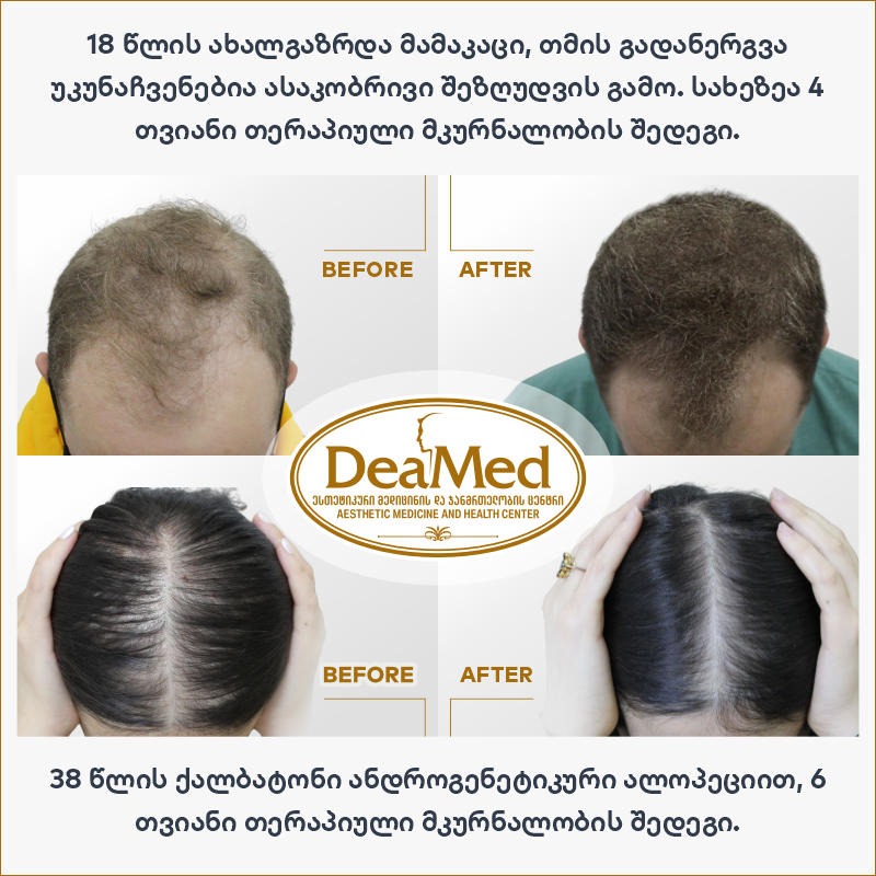 - პირველი განხილული შემთხვევის დროს, როდესაც პაციენტი ძალიან ახალგაზრდაა და აქვს ძლიერი პროგრესირებადი თმის ცვენა, გამოსავალი თერაპიულ მკურნალობაშია, რომელიც მოიცავს როგორც მედიკამენტებს ასევე პროცედურებს. შედეგები ხშირ შემთხვევაში განსაცვიფრებელია, თუმცა ექიმის