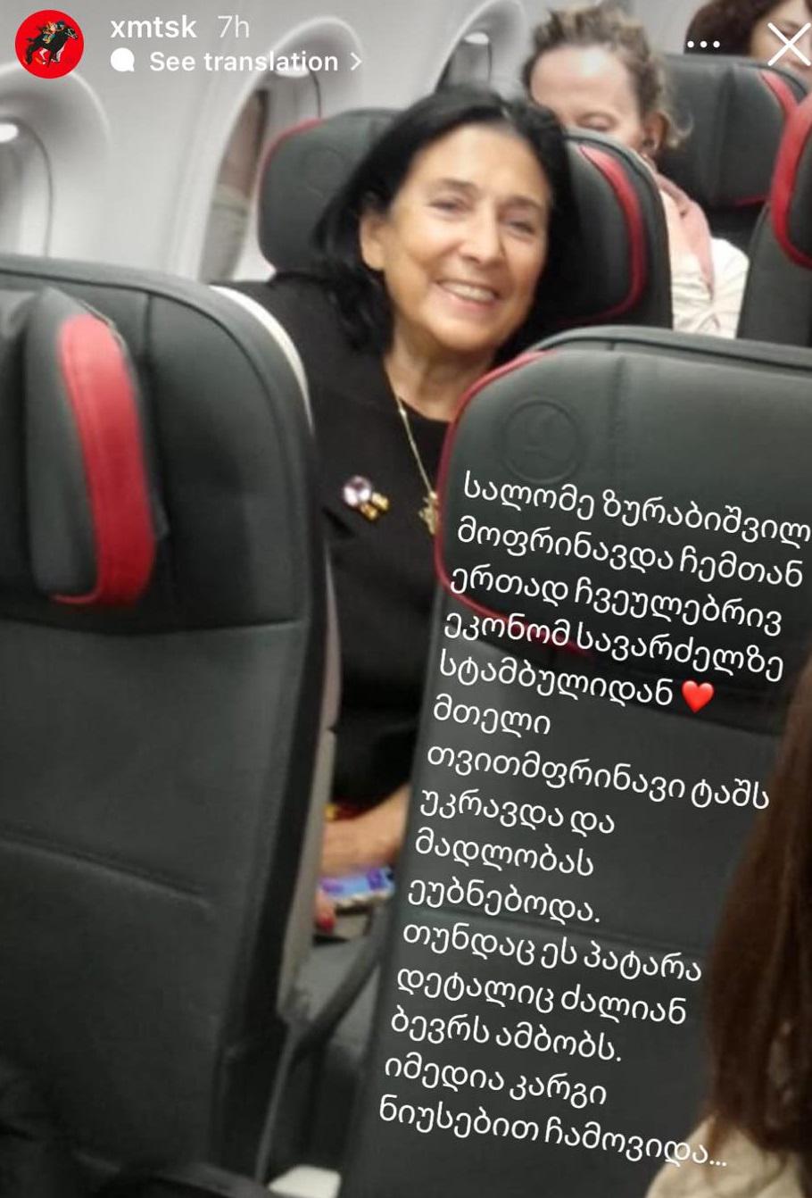 "არც ჩარტერული რეისია და არც სპეც. როგორც მინიმუმ ბიზნეს კლასიც არ არის! ხედავთ ხომ ქალბატონ პრეზიდენტს ეკონომ კლასში?! ზოგ-ზოგიერთები (უკეთაც შეიძლება მათი მოხსენიება) მოგაგონდებოდათ ალბათ...