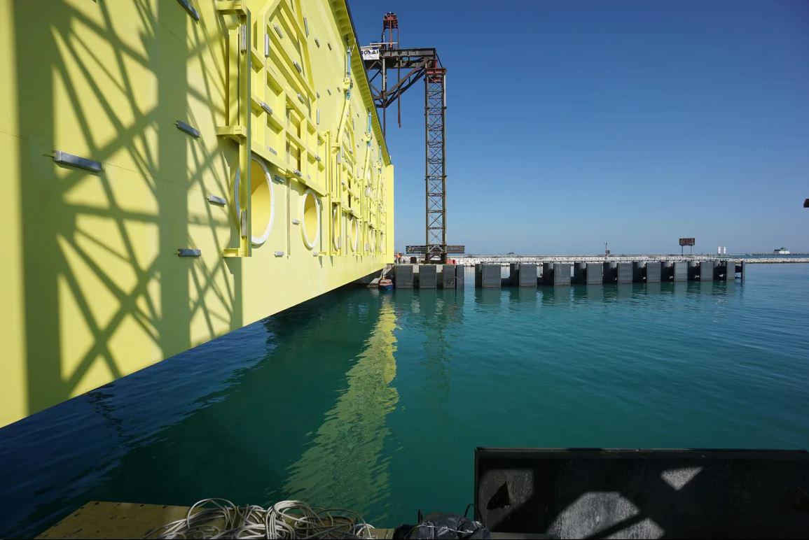 MOSE-ს წყალდიდობის საწინააღმდეგო ბარიერები, რომლებიც 2020 წელს დამონტაჟდა, ტალღებს ლაგუნაში უკიდურესად მაღალი მოქცევის საშუალებას არ აძლევს.