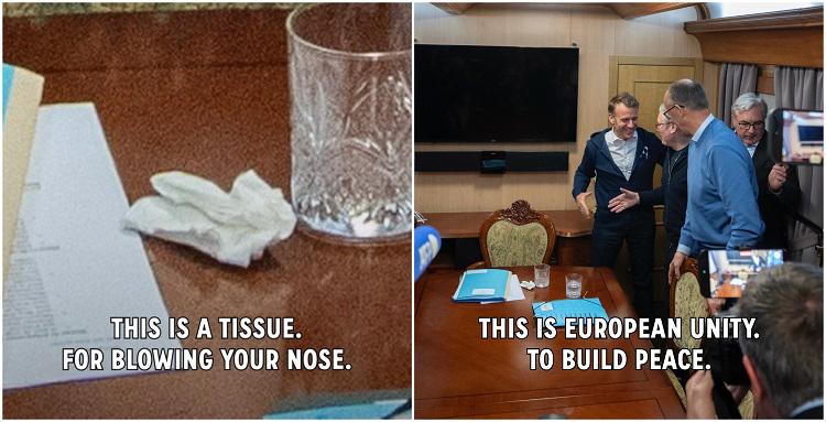 ემანუელ მაკრონის ადმინისტრაცია ორ ფოტოს აქვეყნებს: პირველზე ასახულია მაგიდაზე დადებული ხელსახოცი განმარტებით: "ეს ხელსახოცი გასაწმენდადაა“. მეორე ფოტოზე - ევროპული ქვეყნების ლიდერების ფოტოზე დატანილია წარწერა: "ეს არის ევროპული ერთიანობა მშვიდობის ხელშესაწყობად“.
