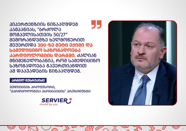 “მინდა მივმართო ნებისმიერ ადამიანს, ვისაც დაუდასტურდა ჰიპერტენზია: მიჰყევით ექიმის დანიშნულებას და არ შეცვალოთ მკურნალობის სქემა თვითნებურად. მკურნალობაზე პაციენტის ცუდი დამყოლობა დიდი გამოწვევაა და ჩვენ ის ერთად უნდა დავამარცხოთ. თუ გაქვთ ეჭვი ჰიპერტენზიის არსებობის შესახებ, აღარ გადადოთ, აიღეთ წნევის აპარატი და გაიზომეთ წნევა. საჭიროების შემთხვევაში კი დროულად მიმართეთ ექიმს და ზედმიწევნით გაითვალისწინეთ მისი რეკომენდაცია” - არჩილ ჩუხრუკიძე, მედიცინის პროფესორი, საქართველოს კარდიოლოგთა ასოციაციის პრეზიდენტი.