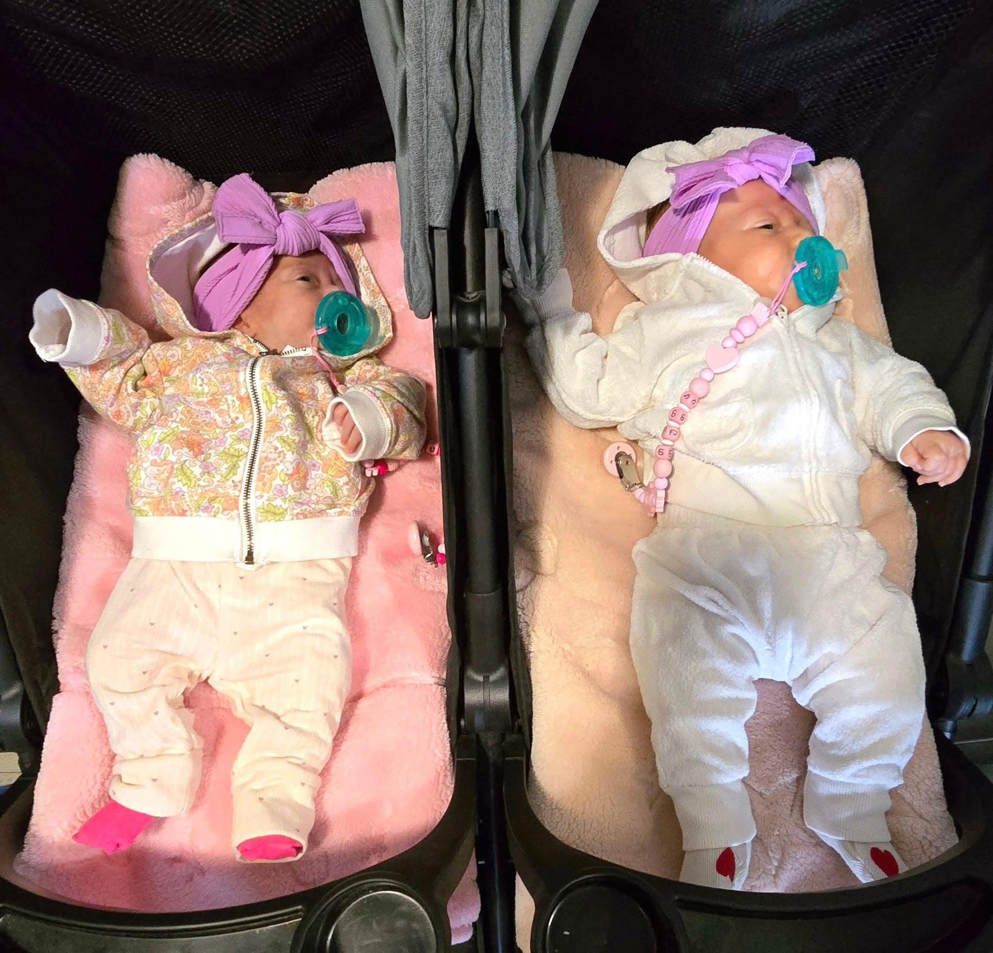 - ფერებით დაახლოებით ერთნაირები, - თმის და თვალის ფერს ვგულისხმობ. ორივე ლურჯთვალები არიან, მეუღლეც ლურჯთვალაა. უკიდურეს უმცირესობაში აღმოვჩნდი - ოჯახში მხოლოდ მე მაქვს ყავისფერი თვალი. იდენტური ტყუპი არ არის, სხვადასხვა კვერცხუჯრედში ისხდნენ. შესაბამისად არც ხასიათებით აღმოჩნდნენ იდენტურები, ყველანაირად სხვადასხვანაირები არიან. აბსოლუტურად განსხვავებული ნაკვთები აქვთ... თუთა „ბულკივით“ ბავშვია. კირა ცოტა წონა ნაკლული (კილო-ნახევარი. თვე-ნახევარი ინკუბატორში იყო) გაჩნდა. თუთა 2 კილო და 900 გრამი გახლდათ... მოკლედ, კირას უნდა, რომ თავისი გაიტანოს, მაგრამ მე ვებრძვი, ისიც - არ მეპუება...