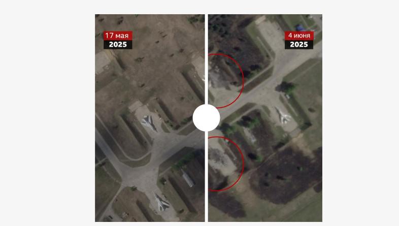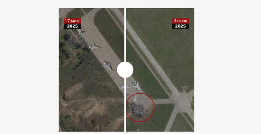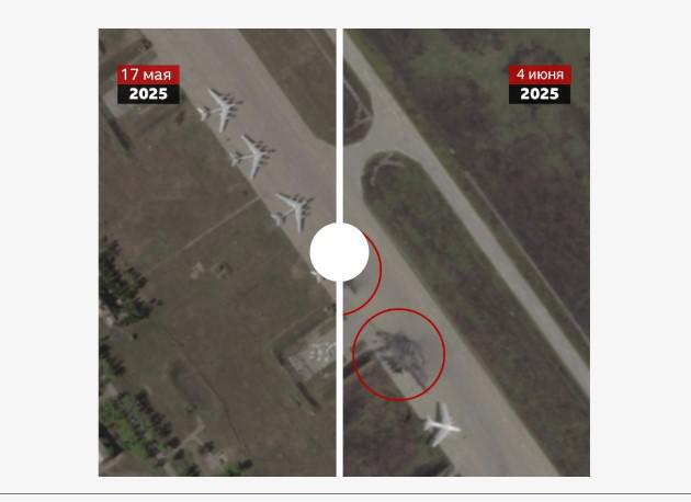 BBC-ის რუსული სამსახურის მიერ გამოქვეყნებულ ახალ სურათებზე, რომლებიც თავდასხმამდე გადაღებულ ფოტოებს ემთხვევა, ნათლად ჩანს განადგურებული თვითმფრინავები. ერთ-ერთ სლაიდერზე მოცემულია Tu-95 ბომბდამშენების სადგომი, სადაც სამი თვითმფრინავია განადგურებული. მომდევნო სლაიდერზე კი Tu-22M3 შორი მოქმედების ბომბდამშენების სადგომია, რომელთაგან ერთი დაიწვა. აღსანიშნავია, რომ თვითმფრინავების დასაცავად სადგომები მიწაყრილით იყო შემოსაზღვრული, თუმცა ამან ვერ შეუშალა ხელი დრონების შეტევას. კიდევ ერთ სურათზე ორი Tu-22M3 თვითმფრინავია განადგურებული, მათ ირგვლივ კი დამწვარი ბალახის მუქი ლაქები ჩანს.