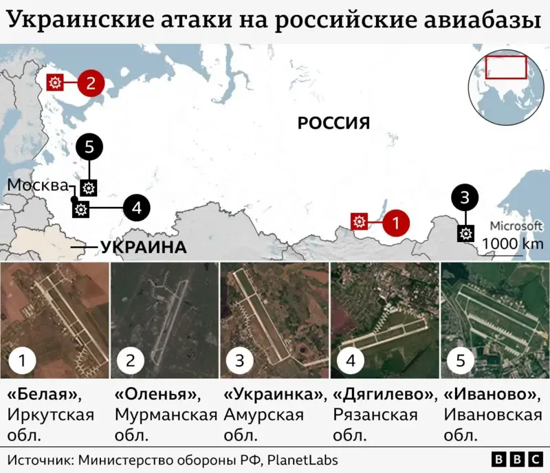 უკრაინულმა დრონებმა 1 ივნისს რუსეთის ორ მნიშვნელოვან ავიაბაზაზე – "ბელაიასა" (ირკუტსკის ოლქი) და "ოლენიაზე“ (მურმანსკის ოლქი) – წარმატებული თავდასხმები განახორციელეს.