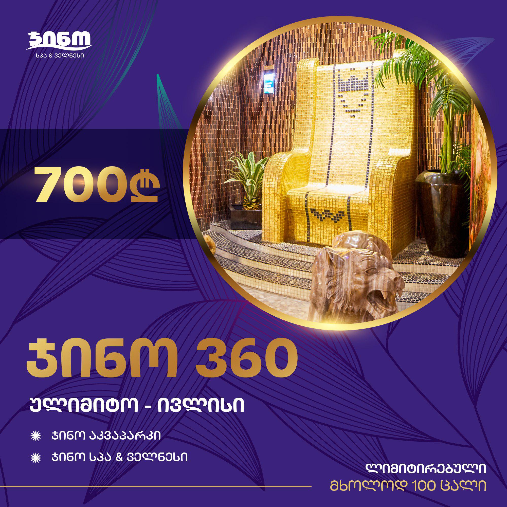 საკუთარ თავზე ზრუნვისთვის „ჯინომ“ ექსკლუზიური შეთავაზება შექმნა. შეუზღუდავი სიამოვნება Gino 360 - ერთთვიან ულიმიტო პაკეტს 700 ლარად შეიძენთ. დამღლელი სამუშაო დღის შემდეგ თუ შაბათს დილიდან ველნეს სივრცეებსა და აკვაპარკში დასვენებასა და გართობაზე უკეთესი რა უნდა აჩუქოთ საკუთარ თავს? თუ „ჯინოს“ კვირაში 5 დღე მაინც ესტუმრებით, თითოეული ვიზიტის ღირებულება 30 ლარამდე გამოდის. სპა და ველნესი მოიცავს: 6 ტიპის საუნას, 24 კარატიანი ოქროთი მოპირკეთებულ, გამთბარ სავარძელს, ცივ აუზს, ცხელ ვირპულს, ტეპიდარიუმს, ყინულის ბორცვსა და ფეხის აბაზანებს, საშხაპეები სხვადასხვა ატრაქციით, აკვაპარკის ღია და დახურულ სივრცეებს.