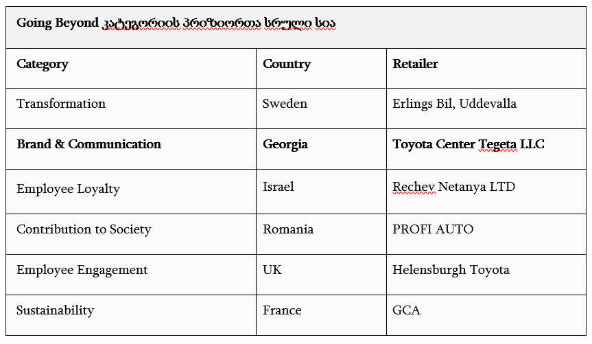 აღსანიშნავია, რომ “ტოიოტა ცენტრი თეგეტა“ არამხოლოდ Ichiban 2025 -ის ჯილდოს მფლობელი არამედ ევროპის მასშტაბით ექსკლუზიურად 6 საუკეთესო ნომინაციაშიც მოხვდა და “Going Beyond” ჯილდო დაიმსახურა, კერძოდ - Brand & Communication-ის კატეგორიაში.