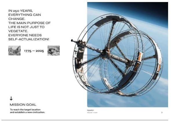 “ჰიპერიონი პროექტმა“ წარმოაჩინა დაახლოებით როგორ შეიძლება გამოიყურებოდეს ის უზარმაზარი, ასეულებით ადამიანზე გათვლილი თვითმყოფადი გარემო, რომელიც საკუთარი თერმობირთვული სინთეზის ძრავებით, ხელოვნური მიზიდულობითა და სოციალური სისტემებით იქნება აღჭურვილი და საუკუნეების განმავლობაში სიმშვიდის შენარჩუნებას მოემსახურება.