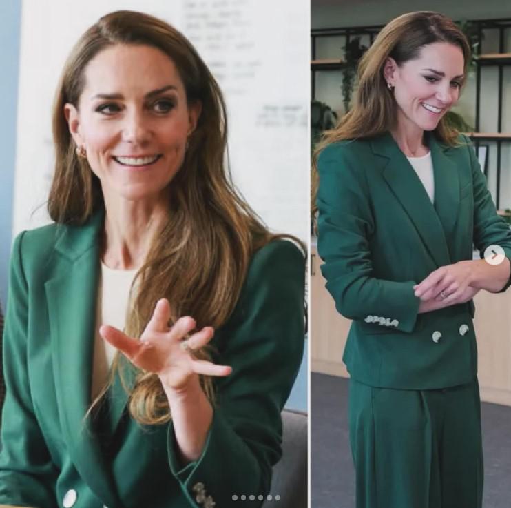 ვიზიტისთვის უელსის პრინცესამ ახალი ლუქი ჩაიცვა - მწვანე ფერის Veronica Beard კოსტუმი, რომელსაც Joseph-ის აბრეშუმის მაისური შეუხამა. პიჯაკის ფასი ამჟამად ფასდაკლებით იყიდება და 489 დოლარია, ხოლო შარვლის ფასი 498 დოლარი.