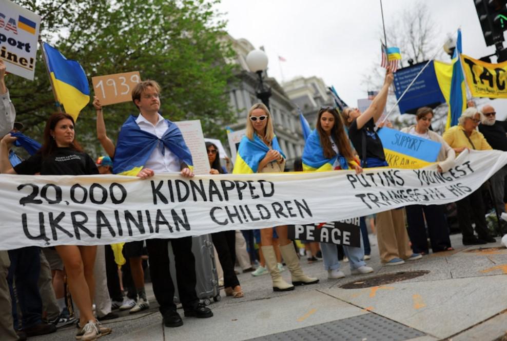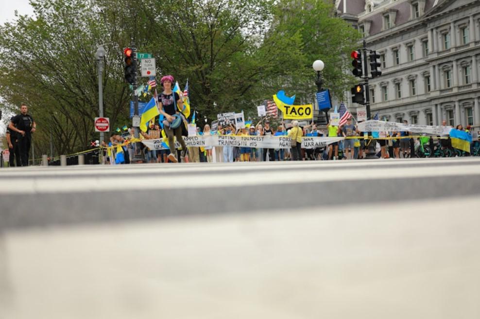 „როიტერი“ ფოტოებს ავრცელებს და წერს, რომ უკრაინის მხარდამჭერები თეთრი სახლისკენ მიმავალი გზის ნაწილზე დგანან და უკრაინისა და ამერიკის დროშებს აფრიალებენ.