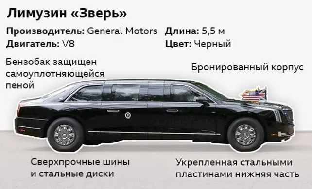 პრეზიდენტის ორი იდენტური ლიმუზინი და საიდუმლო სამსახურისთვის განკუთვნილი რამდენიმე სხვა ავტომობილი , სამხედრო-სატვირთო თვითმფრინავებით დიდ ბრიტანეთში ჯერ კიდევ ტრამპის ჩაფრენამდე ჩაიტანეს.