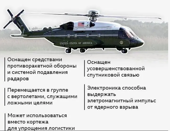 ამის გამო შეიძლება აშშ-ს პრეზიდენტმა თან ვერტმფრენების მთელი პარკი ჩაიყვანა, მათ შორის Marine One — ასე ეწოდება აშშ-ის საზღვაო ქვეითების კორპუსის ნებისმიერ ვერტმფრენს, რომელსაც პრეზიდენტს გადაჰყავს.