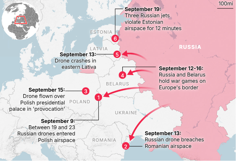 ეს ინციდენტები იმავე დროს მოხდა, როდესაც რუსეთი და ბელარუსი NATO-ს საზღვართან ერთობლივ სამხედრო სწავლებებს (“Запад 2025“) ატარებდნენ. სწავლების მასშტაბი 2021 წელთან შედარებით მოკრძალებული იყო, თუმცა ანალიტიკოსები აღნიშნავენ, რომ რუსეთმა წარსულში სწორედ მსგავსი წვრთნები გამოიყენა, როგორც საფარი ძალების დასაგროვებლად, რათა 2008 წელს საქართველოში და 2022 წელს უკრაინაში ინტერვენცია მოეხდინა.