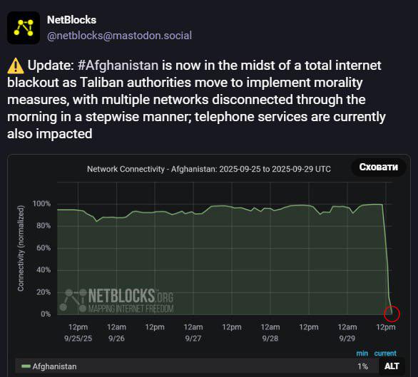 “ავღანეთში ამჟამად ინტერნეტი სრულად გაითიშა. თალიბანის ხელისუფლება "ამორალური აქტივობების პრევენციის“ ზომებს იღებს. დილის განმავლობაში ეტაპობრივად რამდენიმე ქსელი გაითიშა; ასევე, ამჟამად დაზარალდა სატელეფონო მომსახურება,“ - აღნიშნულია განცხადებაში.