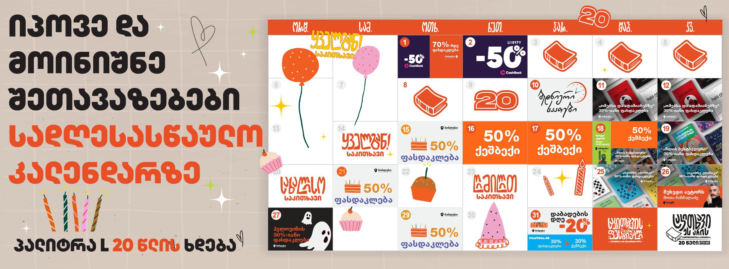 „პალიტრა L” 20 წლისაა. გამომცემლობა საიუბილეო თარიღს 31 ოქტომბერს აღნიშნავს, თუმცა მთელი თვის განმავლობაში მკითხველებს სხვადასხვა შეთავაზებითა და აქციით სარგებლობა შეეძლება.