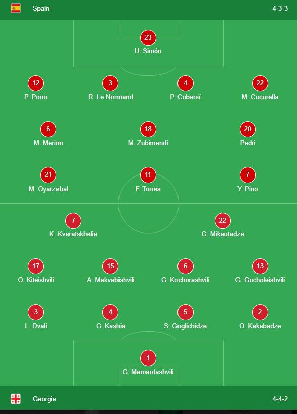 შეიძლება ითქვას, რომ საქართველოს თავდასხმა სრულიად უსაქმოდ იყო, კვარაცხელიას რამდენჯერმე ჰქონდა მცდელობა, რომ გაჰქცეოდა ესპანელ მცველებს, თუმცა ამაოდ. პირველი ტაიმი ისე დასრულდა საქართველოს ნაკრებს მეტოქის კარისკენ არ დაურტყია. ამ ყველაფრის გათვალისწინებით, პირველი ტაიმის ანგარიში 1:0 შეიძლება წარმატებადაც კი ჩაითვალოს.