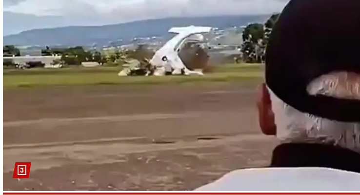 შემთხვევა ვენესუელაში, ტახირას შტატში, ოთხშაბათ დილას მოხდა, კადრებში ჩანს როგორ მიგორავს მსუბუქი ორძრავიანი თვითმფრინავი სან-კრისტობალში მდებარე პარამილიოს აეროდრომის ასაფრენ ზოლზე, მას შემდეგ, რაც ბორბლები მიწას წყდება, თვითმფრინავი გვერდზე მკვეთრად უხვევს, ჰაერში თავდაყირა ტრიალდება და მიწას ცხვირით ენარცხება.