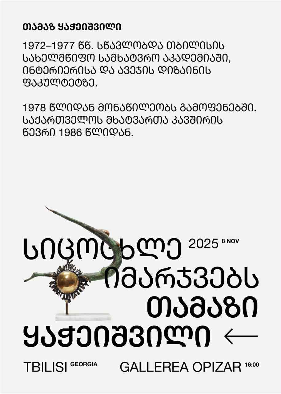გამოფენა გახსნილია ყველა დაინტერესებული სტუმრისთვის. თარიღი: 8 ნოემბერი, 2025 ადგილმდებარეობა: გალერეა „ოპიზარი“ დრო: 16:00 საათი