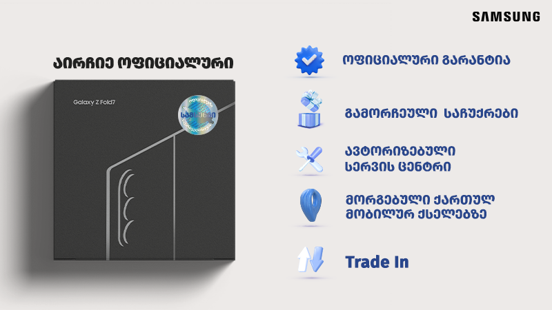 იცით როგორ განასხვაოთ ოფიციალური და არაოფიციალური Samsung-ის მობილური მოწყობილობები? ამის ყველაზე მარტივი გზა არის ოფიციალური ჰოლოგრამა, რომელიც განთავსებულია სმარტფონის ყუთის წინა მხარეს. ჰოლოგრამაზე არსებული წარწერები ქართულ ენაზეა და მისი საშუალებით მარტივად შეგიძლიათ დარწმუნდეთ, რომ თქვენს ხელშია ახალი, ორიგინალი და საქართველოში ოფიციალურად წარმოდგენილი „სამსუნგის“ პროდუქტი.