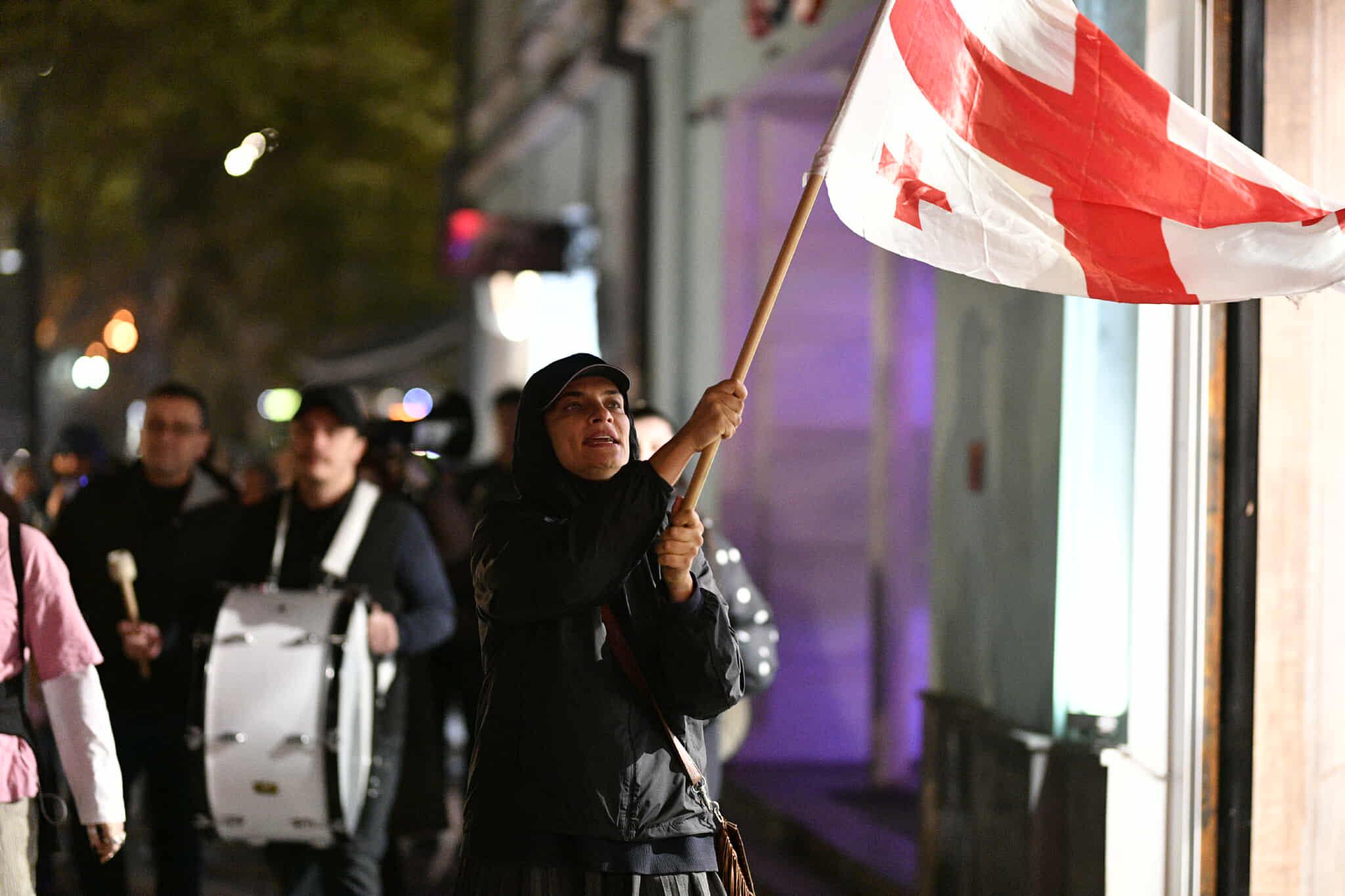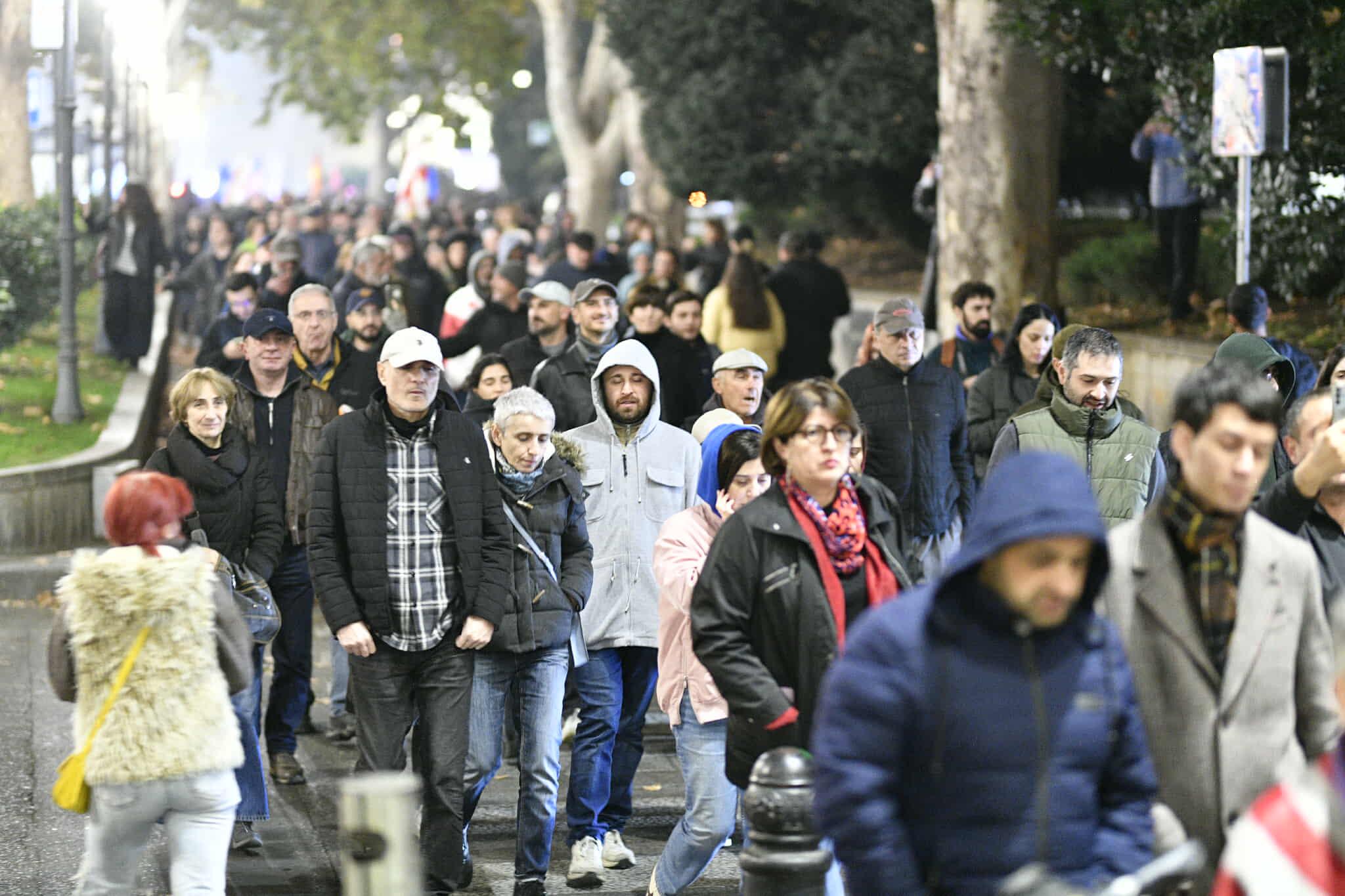 რუსთაველის გამზირზე შეკრებილი აქციის მონაწილეები საპროტესტო მსვლელობას მართავენ.
