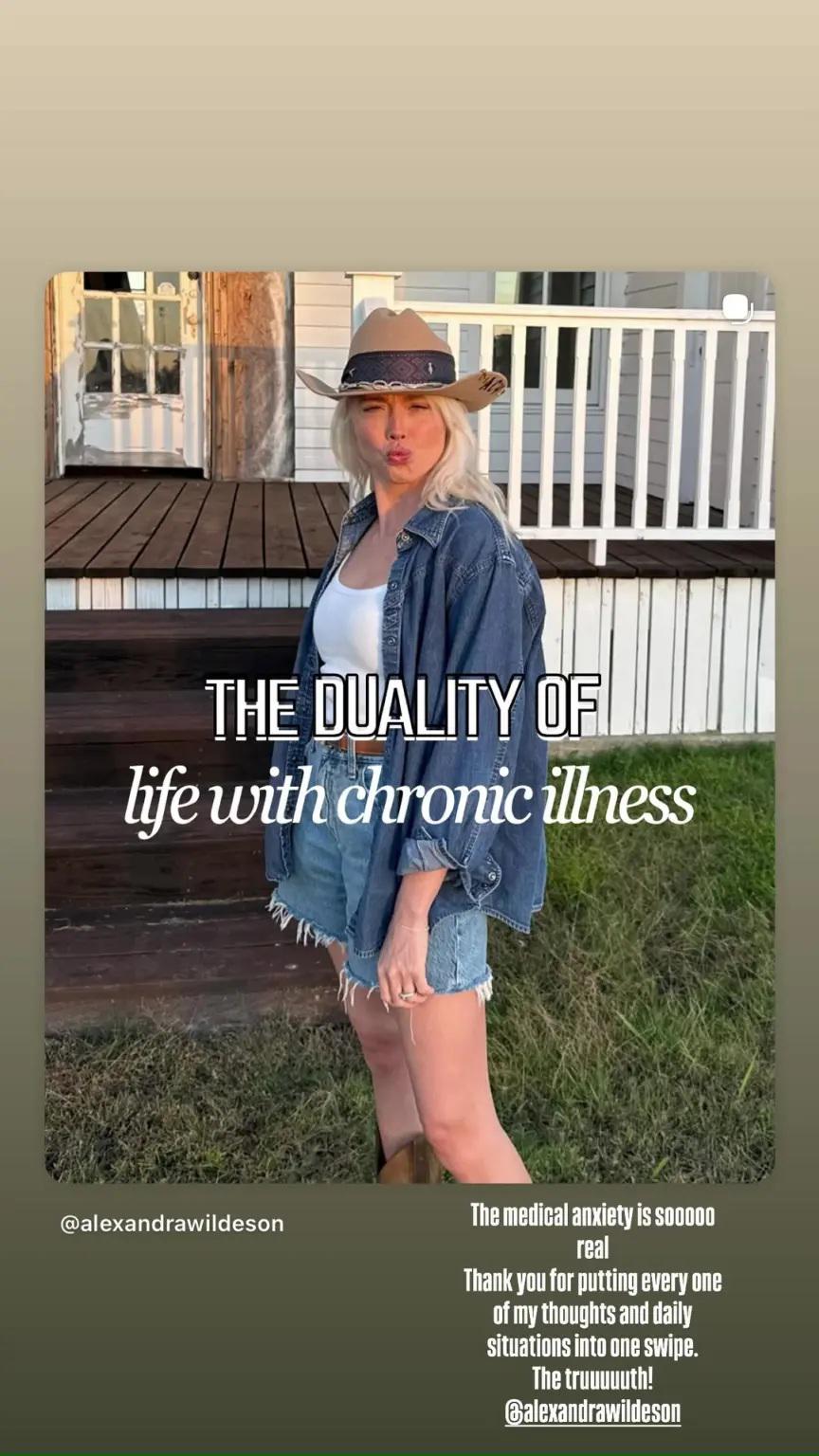 სუპერმოდელმა Instagram-ზე რამდენიმე პოსტი გააზიარა, მათ შორისაა ინფლუენსერ ალექსანდრა უაილდსონის სლაიდები, სადაც წერია: "ცხოვრების ორსახოვნება ქრონიკულ დაავადებასთან ერთად"