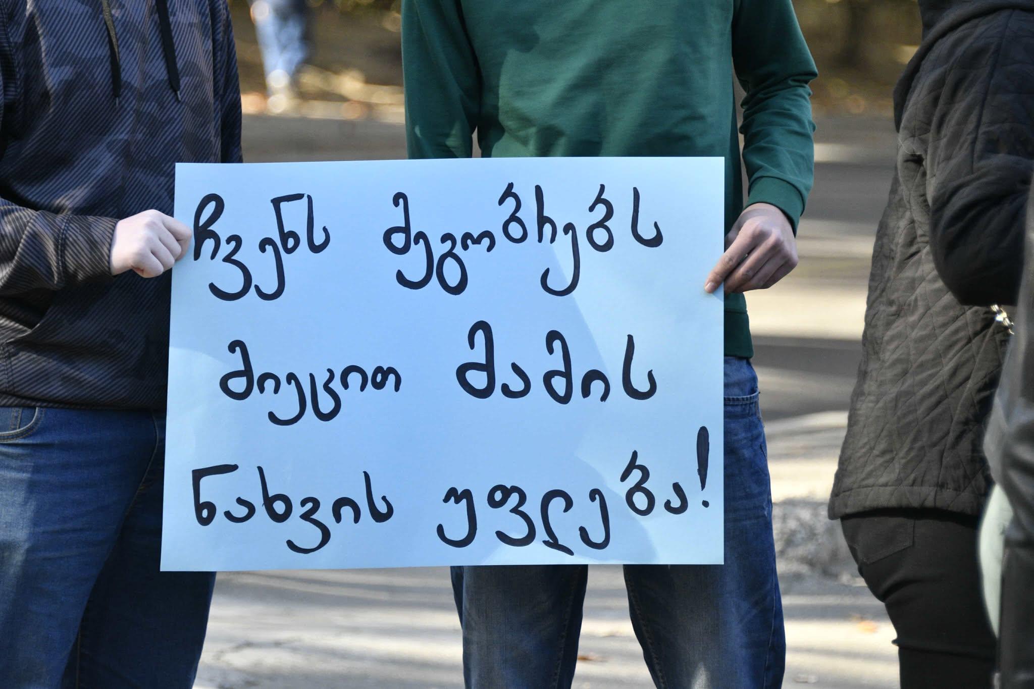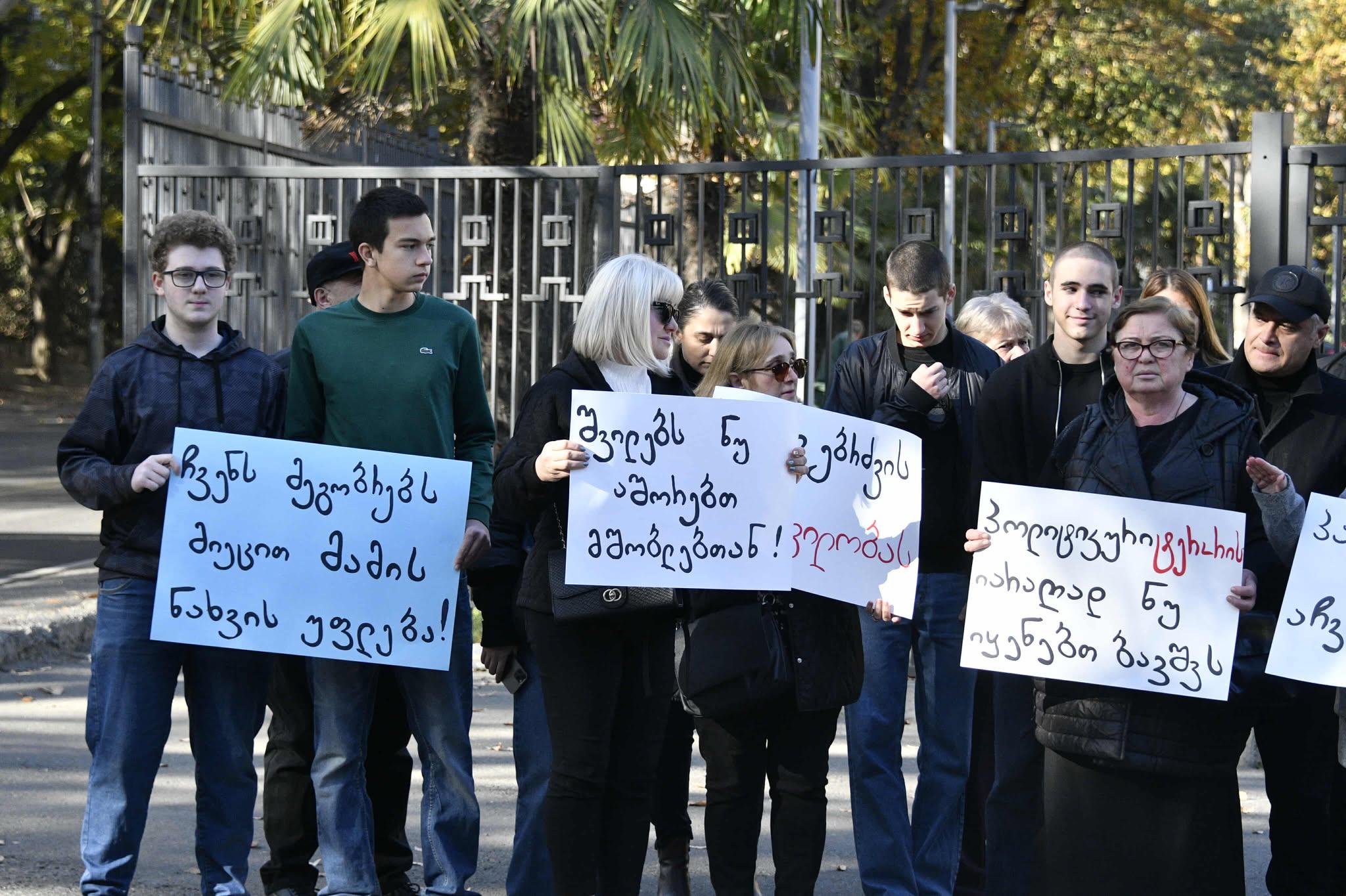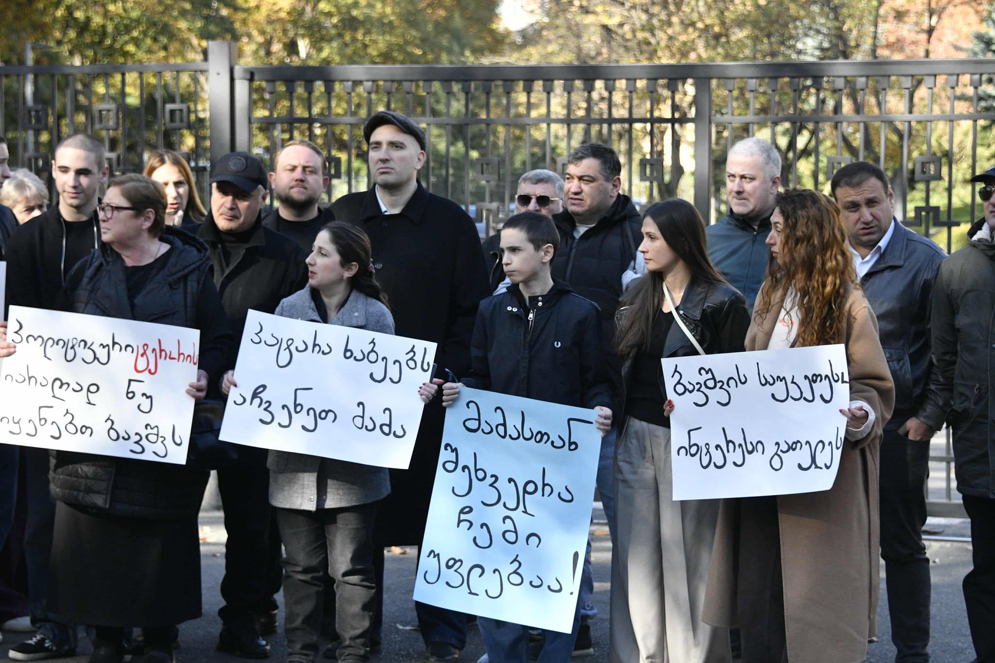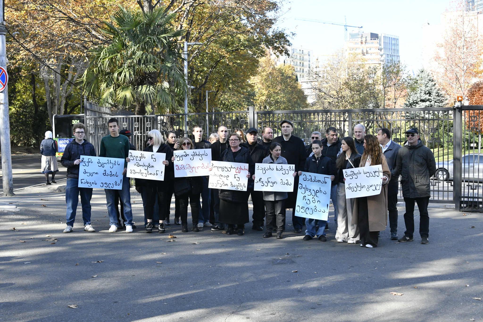 მათ ადგილზე ბანერები აქვთ მიტანილი, წარწერებით - "ბავშვის საუკეთესო ინტერესი გათელეს", "მამასთან შეხვედრა ჩვენი უფლებაა", "პატარა ხაბეებს აჩვენეთ მამა" და ა.შ.