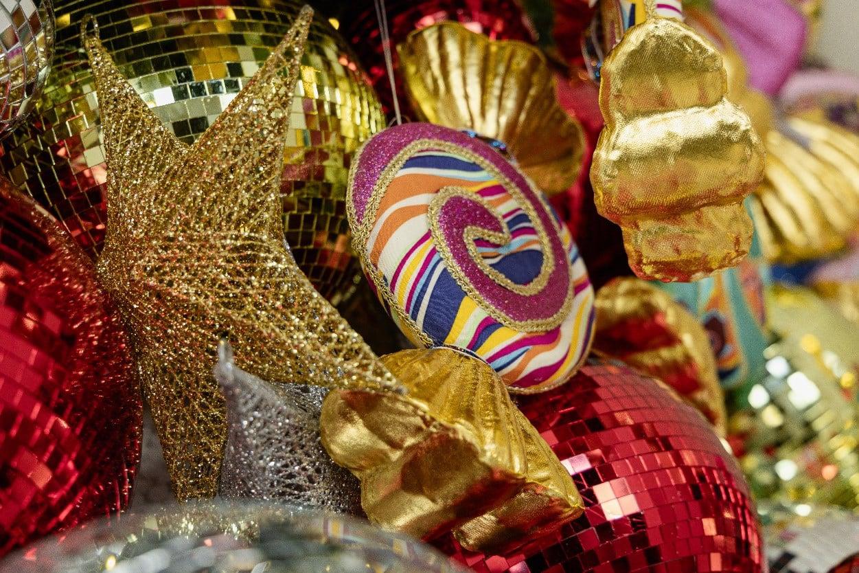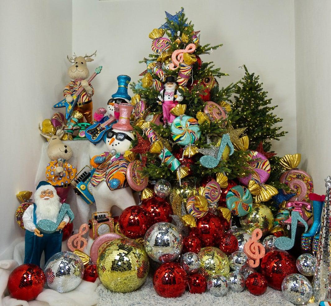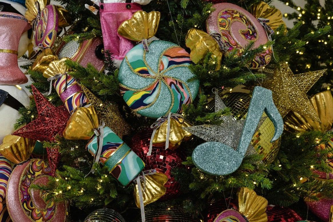 კლასიკურ მწვანე ნაძვის ხეს შემოუწყვეთ უზარმაზარი დისკო ბურთები, მასიური კანფეტები, ფერადი დონატები, ტორტები, გლამურული სამოციანების ფეხსაცმელები პლატფორმაზე, ბრჭყვიალა ვარდისფერი და ფირუზისფერი ტელეფონები, მუსიკალური ნოტები და ბრწყინვალე ვარსკვლავები.