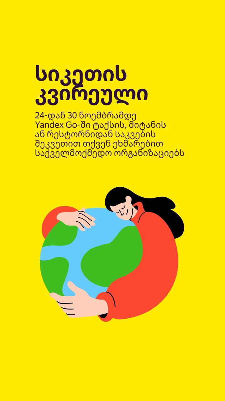 24 ნოემბრიდან Yandex Go საქველმოქმედო კამპანია „სიკეთის კვირეული“ დაიწყო . აქცია 30 ნოემბრამდე გაგრძელდება და ამ პერიოდის განმავლობაში, ტაქსის, საკვების და მიწოდების სერვისებიდან მიღებული სარგებელი მთლიანად ქველმოქმედებას მოხმარდება. შეგროვებული თანხა გადაერიცხებათ ბავშვთა ჰოსპისს და ასევე ოჯახებს, სადაც განსაკუთრებული საჭიროების მქონე ბავშვები იზრდებიან.