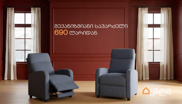 აქციის ფარგლებში 690 ლარიდან შეგიძლიათ შეიძინოთ უმაღლესი ხარისხის მასალებისგან დამზადებული სავარძელი მექანიზმით; ასევე, 3-ადგილიანი დივანი - 1990 ლარიდან; საწოლი სათავსოთი 1590 ლარიდან, სასადილო მაგიდა 6 სკამით 1990 ლარიდან