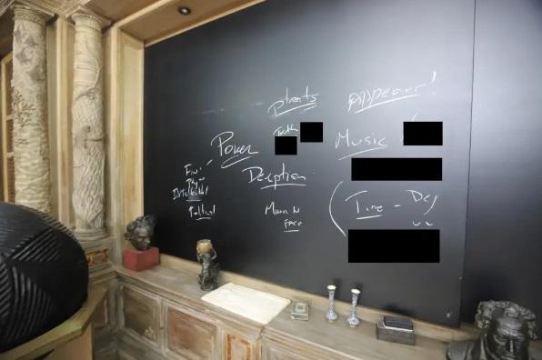 ერთ ფოტოზე რომელიც სავარაუდოდ, ეპშტეინის კაბინეტი იყო, ჩანს დაფა, რომელზეც არეულად წერია სიტყვები - "პოლიტიკური“, "შეთქმულებები“, "მოტყუება“, "ძალაუფლება“, "სიმართლე“ და "მუსიკა“.