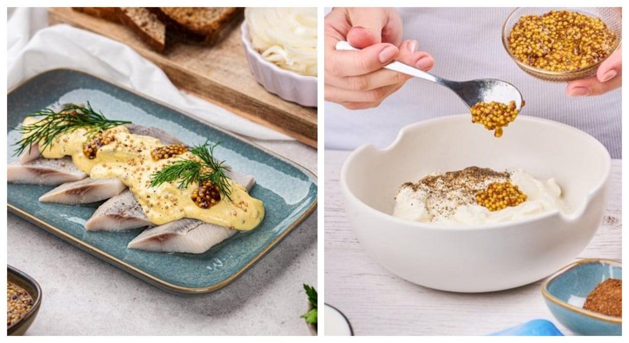 - ბერძნული იოგურტში შეურიეთ მდოგვი (ფრანგული ან დიჟონის, მარცვლები), კარის სანელებელი და პილპილი.