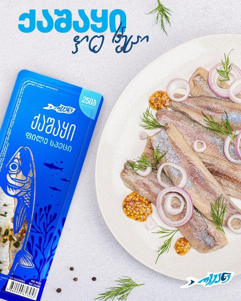 - ქაშაყის ფილე „სპეცი“ 250 გ. სანელებლებითა და ზეთით შეზავებული, ზომიერად მარილიანი