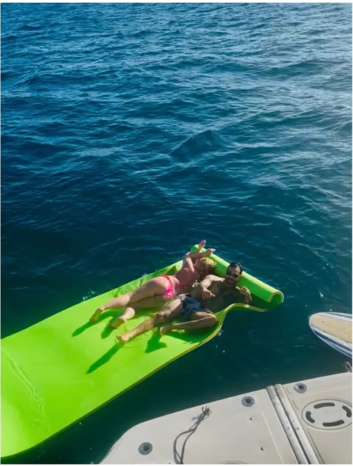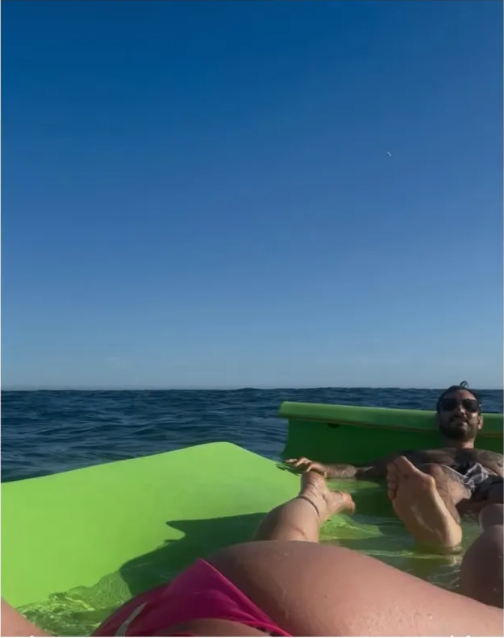 სხვაგან წყვილი ასევე ერთად ,ზღვაში რეზინის მწვანე ტივზე არიან გაწოლილები.