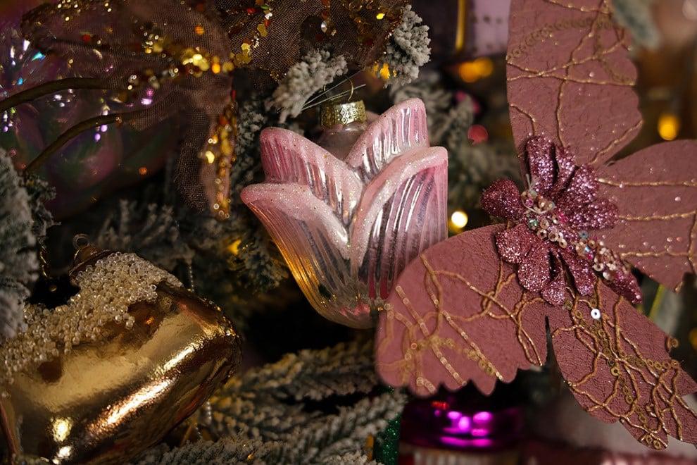 2026 წლის ტენდენციების მიხედვით, რეკომენდებულია მაქსიმუმ 2–3 ძირითადი ფერის გამოყენება. ზედმეტად მრავალფეროვანი პალიტრა ხეს გადატვირთავს. წელს განსაკუთრებით აქტუალურია მწვანე და ოქროსფერი, ვარდისფერი და ვერცხლისფერი, ასევე მიწისფერი ტონები - ყავისფერი, ტერაკოტა, ღია ბეჟი. ერთიანი ფერთა სქემა ქმნის ელეგანტურ და დახვეწილ იერს.