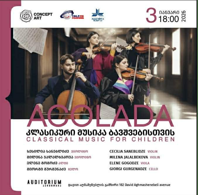 კლასიკური მუსიკა ბავშვებისთვის 3 იანვარს კონცეპტArt-ის ჯადოსნური პროექტი ერთი დღით ბრუნდება! ბილეთებიც დაიდო: https://biletebi.ge/concerts/acolada ACOLADA თუ გსურთ, რომ თქვენს შვილებს კრეატიული აზროვნების უნარი განუვითარდეთ, თან გაერთონ და თან მოისმინონ მოცარტის, ჰაიდნის და სხვა ევროპელი კომპოზიტორების ნაწარმოებები, გია ყანჩელის, სულხან ცინცაძისა და ვაჟა აზარაშვილის შედევრებთან ერთად - მაშინ გელოდებით!
