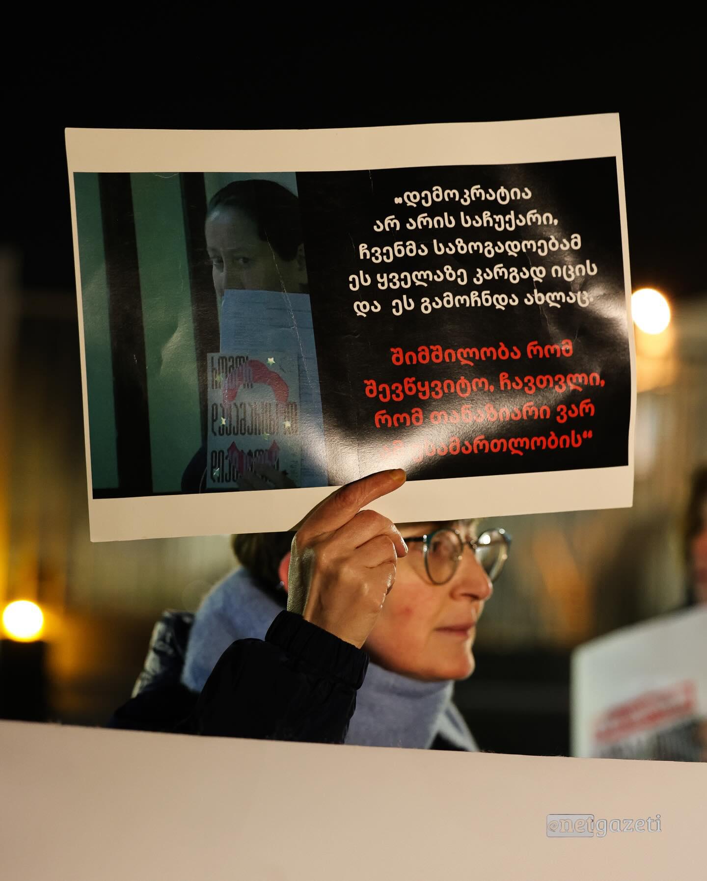 ,,ჩვენი მთავარი სათქმელი არის მზიას გამხნევება და სოლიდარობა. კიდევ ერთხელ გავაპროტესტეთ მისი უკანონო პატიმრობა. მზიას საქმე და მისი პატიმრობა არის ერთ-ერთი ყველაზე სამარცხვინო ლაქა ამ ხელისუფლების ისტორიაში და ასე დარჩება. როდესაც ამ ხელისუფლებას გაიხსენებენ, ბევრი სამარცხვინო საქმე აქვს, მაგრამ ყველაზე სამარცხვინო საქმედ გაიხსენებენ სწორედ მზია ამაღლობელის უკანონო პატიმრობას. მზია ამაღლობელის პატიმრობა მოწმობს იმას, რომ ეს არის არა სამართალი, არამედ შურისძიება თავისუფლების მოყვარე ადამიანებზე, შურისძიება იმ ხალხზე, ვინც ან ქვეყანაში დიქტატურის დამყარებას არ ეგუება. ეს არის სიგნალი ადამიანებისთვის, რომ თუ თქვენ არ დაემორჩილებით რეჟიმს და პროტესტს გამოხატავთ, ყველა შეიძლება ასე დაისაჯოთო იმიტომ, რომ ამ ქვეყანაში არ არსებობს სამართალი, არსებობს რეჟიმის შურისძიება",-განაცხადა მერაბ მეტრეველმა.